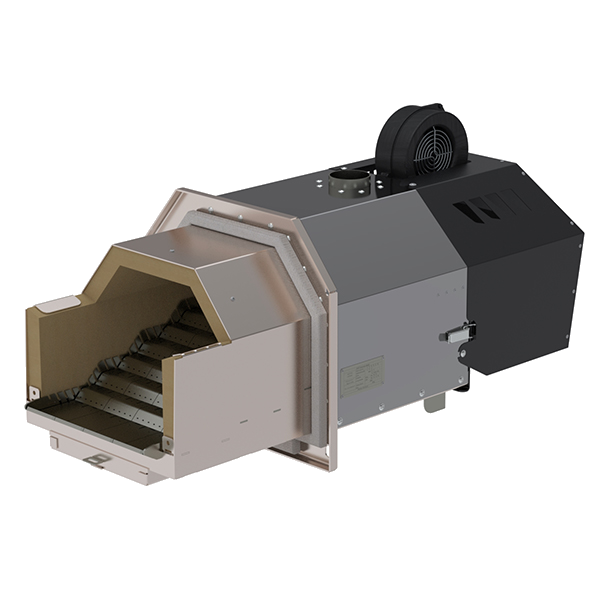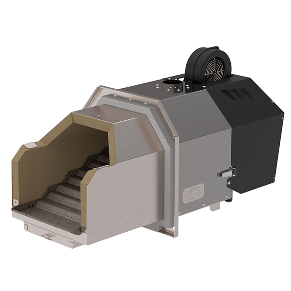 Industrial 125 kW pellet burner. Cascade grate block with self-cleaning, Double Air dynamic distribution, chamber lining.